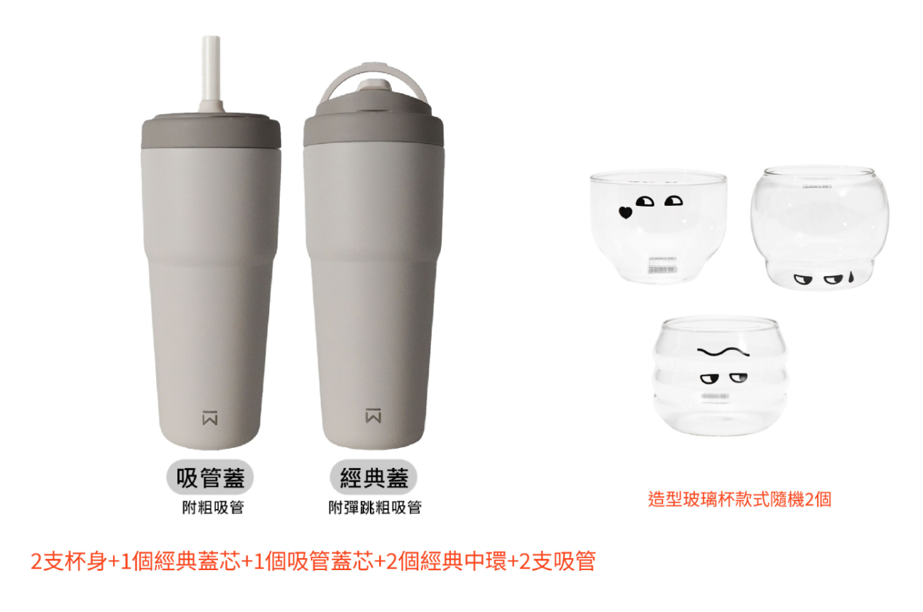 含杯身任選2入+經典中環X2+經典蓋芯X1+吸管蓋芯X1+吸管X2+造型玻璃杯(款式隨機)X2