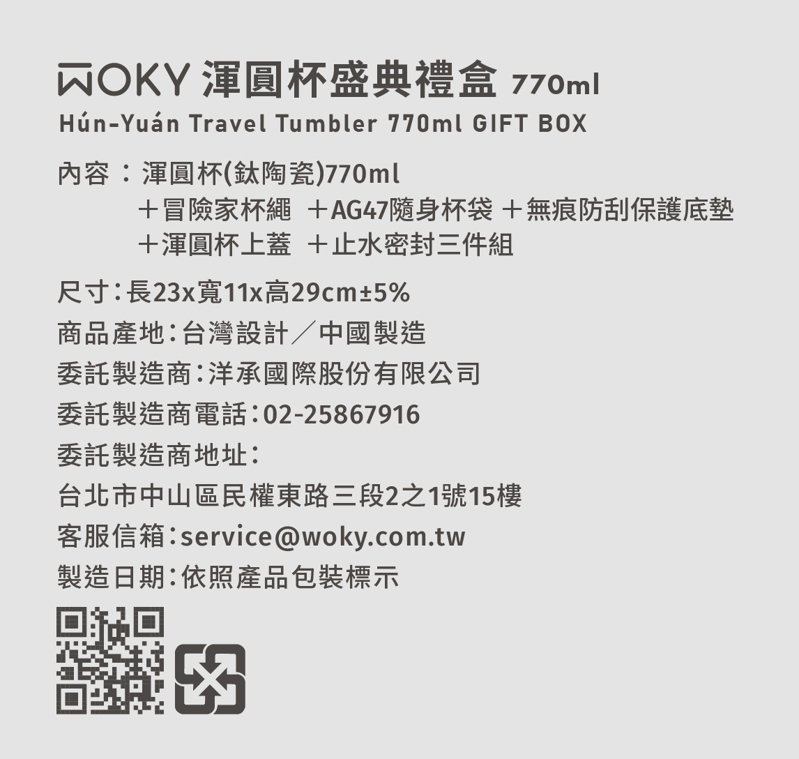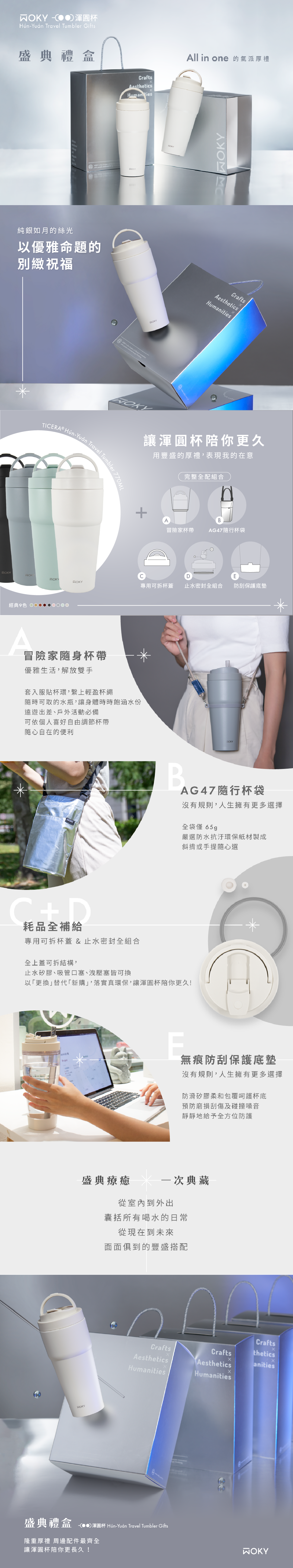 來自Woky 最真摯的祝福,All in one的氣派厚禮──「渾圓杯盛典禮盒」包括提袋、杯繩、底墊、杯蓋與矽膠備品,完整全配組合,讓渾圓杯陪你更久。